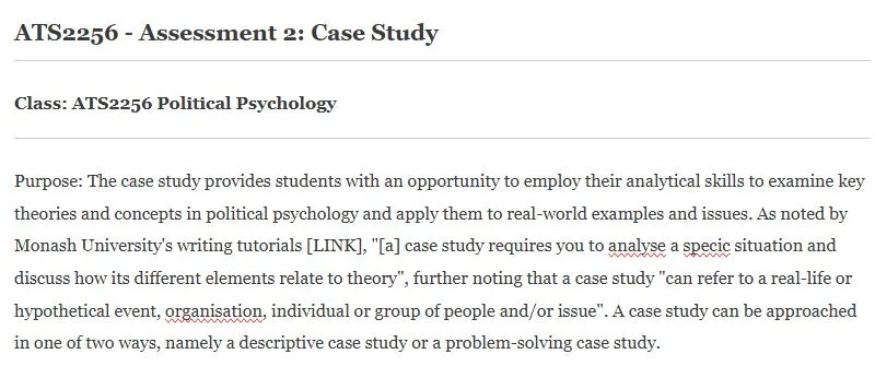 Purpose: The case study provides students with an opportunity to employ their analytical skills to examine key theories and concepts in political psychology and apply them to real-world examples and issues. As noted by Monash University’s writing tutorials [LINK], “[a] case study requires you to analyse a specic situation and discuss how its different elements relate to theory”, further noting that a case study “can refer to a real-life or hypothetical event, organisation, individual or group of people and/or issue”. A case study can be approached in one of two ways, namely a descriptive case study or a problem-solving case study.