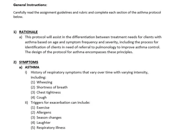 - Complete the protocol outline templateLinks to an external site.to develop a protocol for asthma treatment. Use of the template is required. A 10% deduction will be applied if the template is not used. See the rubric.
