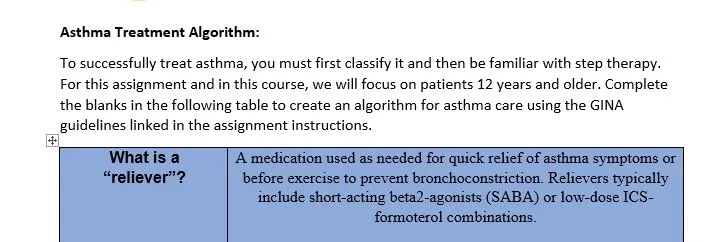 | What is a “reliever”? | A medication used as needed for quick relief of asthma symptoms or before exercise to prevent bronchoconstriction. Relievers typically include short-acting beta2-agonists (SABA) or low-dose ICS-formoterol combinations. |